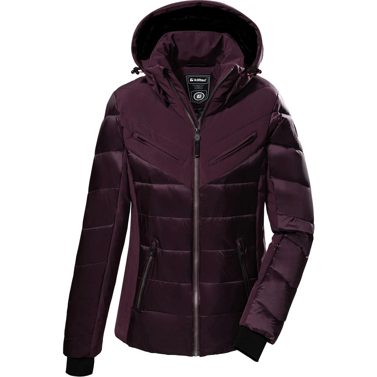 Die Hochglanz-Steppjacke in Daunenoptik von killtec besticht durch ihren trendigen Look und metallische Elemente. Sie macht sowohl auf der Piste als auch in der City eine gute Figur. Sie ist wasserabweisend und winddicht mit einer Wassersäule von 10.000 mm und gleichzeitig atmungsaktiv mit einer Wasserdampfdurchlässigkeit von 3.000 g/m²/24 h. Die Skijacke ist mit einem gummierten, rutschfesten Schneefang ausgestattet. Mehrere Reißverschluss- und Innentaschen bieten genügend Stauraum für Skipass, Handy und Co. Lycramanschetten mit Daumenöffnungen verhindern das Eindringen von Wind in den Ärmel. Die abnehmbare Kapuze und der Kragen sind mit weichem Fleece gefüttert. Das Kunstfell der Kapuze lässt sich bei Bedarf abnehmen. Der Frontreißverschluss ist mit einem Kinnschutz versehen. killtec liegt es besonders am Herzen, die Kollektionen nachhaltiger und zukunftsfähiger zu machen. So setzt killtec verstärkt auf verantwortungsbewusstere Herstellungsverfahren. Diese Jacke ist daher PFC-frei.