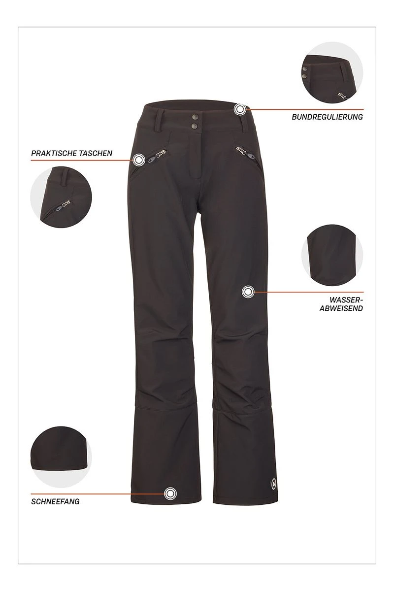 Die Softshell Hose Nynia von killtec ist aus atmungsaktivem Material und ist mit einer 8.000 mm Wassersäule wasserabweisend. Das weiche antipilling Microfleece in der Innenseite hält schön warm und der am Hosensaum integrierte Schneefang macht die Hose tauglich für die Piste. Der Reißverschluss am Beinabschluss sorgt für leichteres An- und Ausziehen.