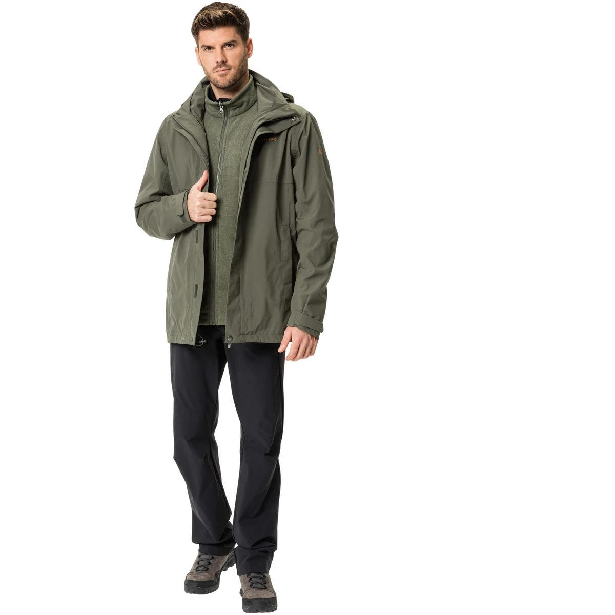Eine vielseitige Wanderjacke für alle, die einen wetterfesten, natürlichen aber auch einen sportiven Begleiter suchen. Diese klassische Trekkingjacke hat ein starkes Auftreten und eine wasser- und winddichte PU-Membran, die locker mit wechselhaftem Bergwetter zurechtkommt. Damit Kopf und Nacken beim Wandern vor Regen und Wind geschützt sind, lässt sich die regulierbare Kapuze rasch aus dem Kragen holen. Für zusätzlichen Wärmeschutz kann der Saum der Outdoorjacke durch die Taschen hindurch enger gestellt werden. Die bequeme Innenjacke aus angerautem Fleece wärmt den Körper auf eine Art, die auch bei Anstrengung noch angenehm ist. Durch die Kombinierbarkeit der beiden Jacken wird eine sehr große Bandbreite an Wetter- und Temperaturbedingungen abgedeckt. Diese Doppeljacke zum Wandern ist mit Eco Finish umweltfreundlich wasserabweisend ohne Fluorcarbone (PFC) hergestellt. Das VAUDE Green Shape-Label steht für ein umweltfreundliches, funktionelles Produkt aus nachhaltigen und bluesign® zertifizierten Materialien.